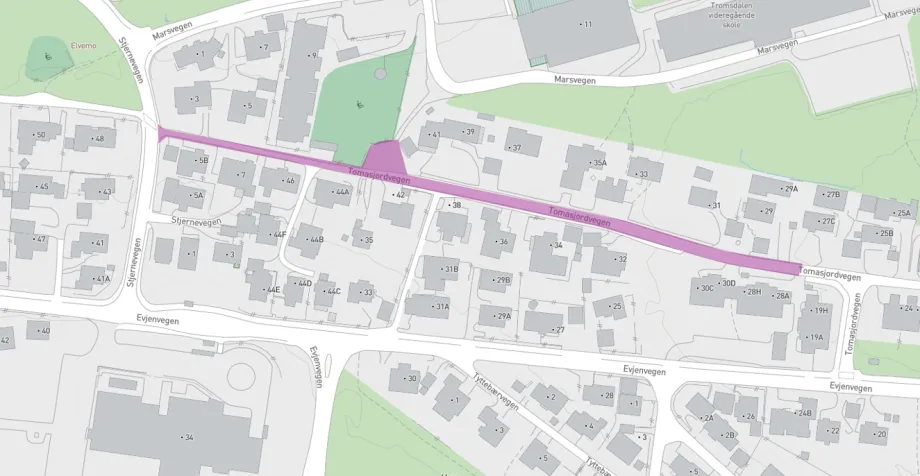 Overvannsledning fra Marsvegen til Evjenvegen er i så dårlig stand at den skal byttes ut og legges i en ny trasé. I dag går deler av overvannsledningen under privat grunn, men den nye skal legges i offentlig vei. Da sikrer vi god tilgang til ledningen for fremtiden.
